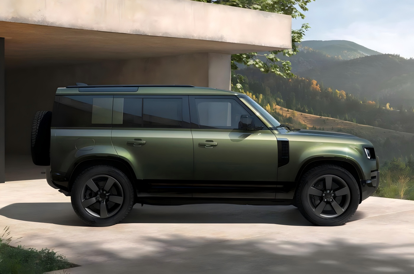ด้านข้าง. มุมมองจากด้านข้าง รถใหม่ ยังคงสไตล์คลาสสิกของ Land Rover Defender รุ่น 110 ใช้ดีไซน์แบบ 4 ประตู โดดเด่นด้วยบังโคลนหน้าและหลังที่กว้าง พร้อมด้วยล้อแบบ 5 ก้านและคาลิปเปอร์เบรกแบบหลายลูกสูบ ขนาดตัวถังยังคงไม่เปลี่ยนแปลง โดยมีความยาว ความกว้าง และความสูง 5018/2105/1967 มม. ตามลำดับ และระยะฐานล้อ 3022 มม.