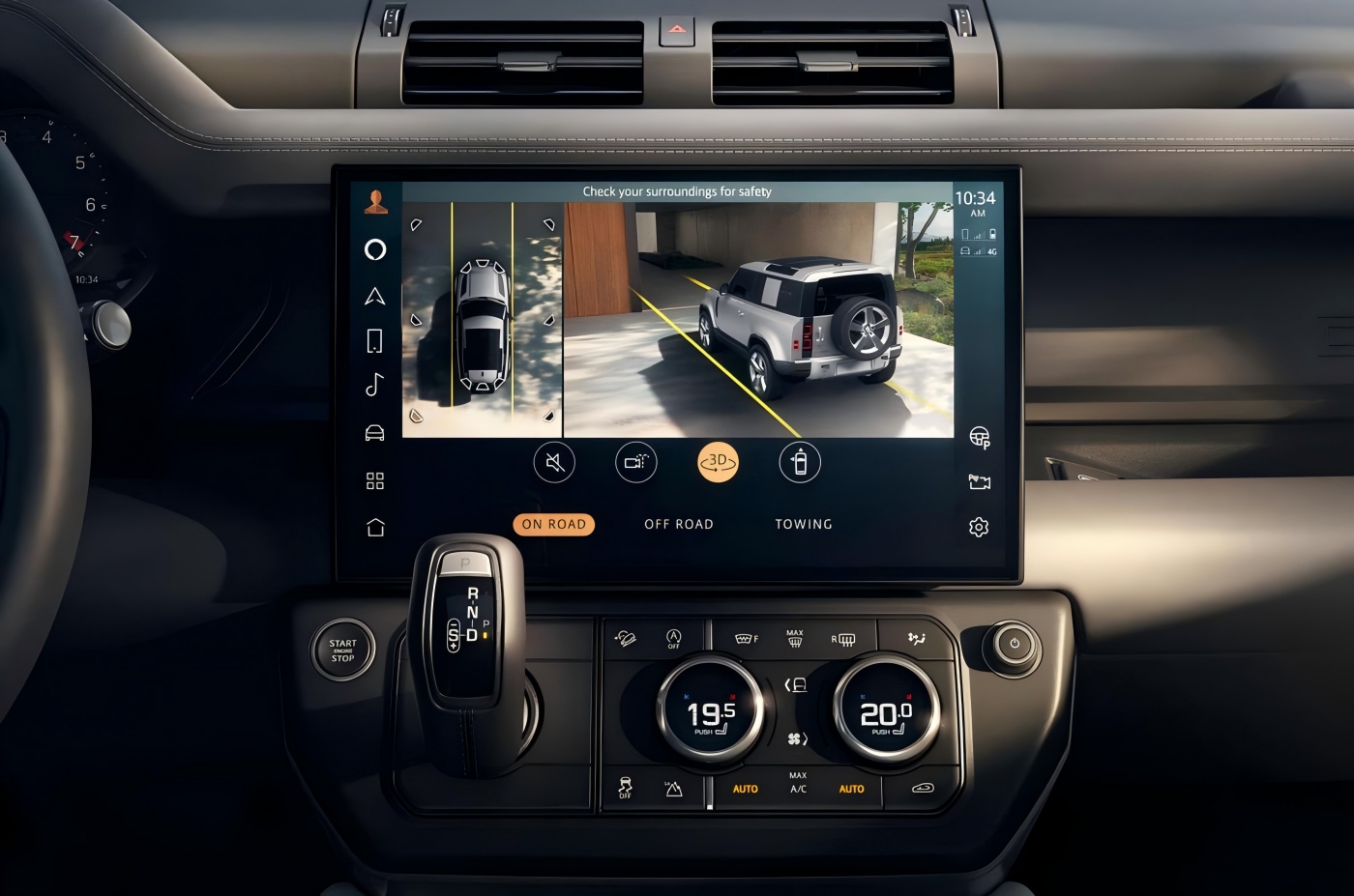 ภายใน. ในส่วนของภายใน เค้าโครงโดยรวมของรถใหม่ไม่ได้เปลี่ยนแปลงมากนัก ยังคงมาพร้อมแผงหน้าปัดคริสตัลเหลวเต็มรูปแบบ และพวงมาลัยมัลติฟังก์ชั่นแบบ 3 ก้าน หน้าจอแสดงผลมัลติมีเดียตรงกลางคอนโซลกลางได้รับการอัพเกรดจาก 11.4 นิ้ว เป็น 13.1 นิ้ว ในขณะเดียวกัน ยานพาหนะใหม่ได้เพิ่มระบบตรวจสอบผู้ขับขี่ ระบบการตรวจสอบนี้สอดคล้องกับกฎระเบียบของ EU GSR2 หากตรวจพบว่าคนขับไม่ใส่ใจถนนข้างหน้า ระบบจะส่งสัญญาณเตือนด้วยเสียงและวิดีโอ อย่างไรก็ตาม สามารถตั้งค่าระบบช่วยเหลือผู้ขับขี่เป็นปิดใช้งานได้ในตัวเลือกบนหน้าจอคอนโซลกลาง นอกจากนี้ ระบบควบคุมความเร็วคงที่แบบออฟโรดแบบปรับได้ของ Land Rover ยังถูกนำเสนอเป็นครั้งแรกบน Land Rover Defender ในรูปแบบอุปกรณ์เสริม